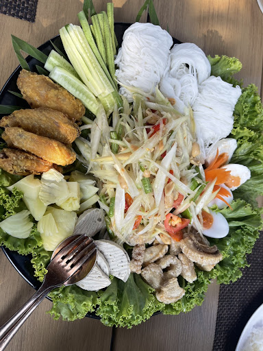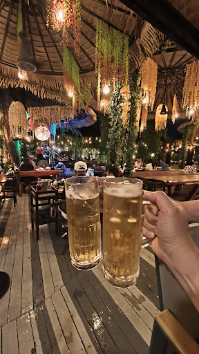 The restaurant zone is situated at the middle of the resort, surrounded by lush trees and featuring a small pond in front of the live music stage. It's the perfect spot to unwind in the evening while enjoying the ambiance. The singer was exceptionally talented, with a truly beautiful voice. The performance likely begins around 7 PM, though it's a good idea to call and confirm. During our visit, the singer performed two separate sets with a break. We chose to sit at the bar on comfortable stools, sipping on beer accompanied by the live music. The cool, serene atmosphere of the light rain added to the mood as we watched the bartender...