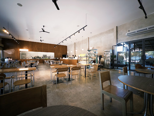 • ตัวร้านตกแต่งสไตล์มินิมอล โทนสีขาว-ไม้ ดูสะอาดโปร่ง นั่งสบาย