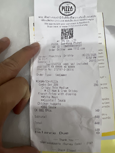 เราเข้าไปสั่งออเดอร์ take away ชุดโปร 299 พิซซ่าหน้า เบคอน+ปูอัด แบบเบสิค แบบบางกรอบ ไก่บาบิคิว พนักงานบอกให้รอประมาณ 15 นาที จนเวลาล่วงเลยไปกว่าครึ่งชม. เราเห็นลูกค้าต่างชาติที่เข้ามาหลังเรา เค้านั่งกิน จนจบกำลังเช็คบิล แต่ออเดอร์เรา ยังไม่ได้