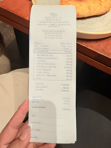 Read moreFresca is a stunning, newly built dining complex in Phuket that offers a sophisticated yet relaxed atmosphere. The architecture and interior design are modern and stylish, providing a chic ambiance perfect for both casual dining and special occasions. However, one thing to note is that the location is a bit off the beaten path. Itâs situated farther away from the main tourist hubs, so be prepared for a bit of a drive. That said, the journey is absolutely worth it for the dining experience that awaits.