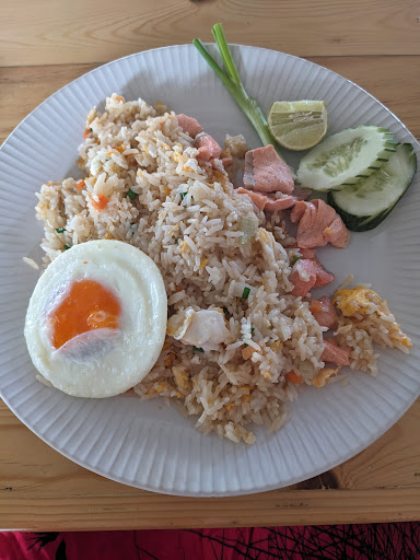 Very nice place to stop for tasty and cheap food! Menu is in English, with lots of options. I had the salmon fried rice with an extra fried egg and Italian soda. Staff were lovely and friendly. Prices were very reasonable. A good meal for under £5 - can't ask for more! Edited to add that after such a great first trip I ate here almost every day for the week that I was in the area, and had a variety of dishes which were all very tasty and reasonably priced, and the staff were always helpful and friendly. The eating area is outdoors but under cover, and although that means no Aircon, there are lots of fans - the staff always turned on the one pointing at my table when I arrived. Be prepared with some mosquito spray if you're going to be there when it gets dark, though!
