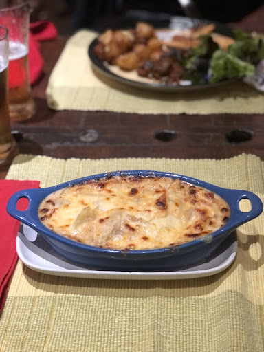 The potato, bacon, and cheese dish I ordered was rich and smooth, very delicious. The accompanying bread was also very high quality. The bruschetta parm appetizer was delectable as well. My friendâs sole (fish) and potato dish was very tasty and cooked perfectly.