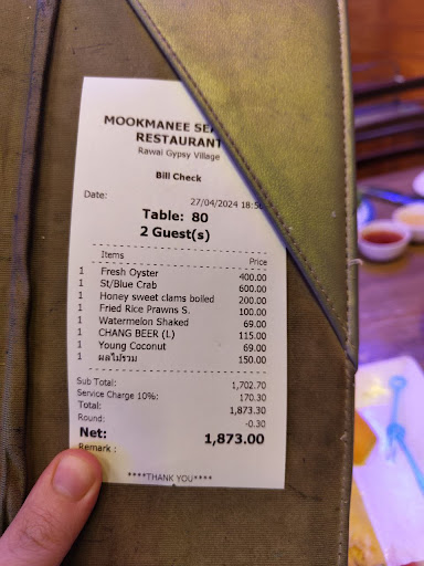 Read moreWir waren am ersten Tag des Songkran Fest 2022 am Abend als kleine Gruppe von 5 Personen im Mook Manee. Vor dem Eingang zur Meerseite hatte sich bereits eine kleine Schlange gebildet. Man musste sich bei einem Ober eine Wartenummer geben lassen. Ob sich andere vordrÃĪngen interessiert den Ober herzlich wenig. Es wurde erklÃĪrt, man kÃķnnte Gerichte, bzw. frischen Fisch im Lokal bestellen, jedoch wÞrde der Fisch vom naheliegenden Fischmarkt geholt, was Zeit in Anspruch nehmen wÞrde, da die KÞche sehr beschÃĪftigt sei. Alternativ kÃķnne man selber zum Markt gehen und seine MeeresfrÞchte kaufen. Diese werden dann gegen eine GebÞhr von der KÞche des Mook Manee zubereitet. Wir entschlossen uns selber zu kaufen. Nach einiger Wartezeit bekamen wir dann einen Tisch, der noch von den vorherigen GÃĪsten verdreckt war, sprich es lagen einige Essensreste auf dem Tisch. Der Kellner wischte diese mit einem einfachen feuchten Tuch auf den Boden, einige Reste blieben jedoch am Tisch liegen....gut kann in Thailand schon mal vorkommen, ist mir jedoch in den letzten Jahren eher nicht vorgekommen, nicht einmal in den einfachsten Restaurants.