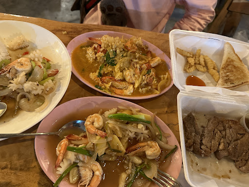 Read moreTrès bonne cuisine. Beaucoup de choix de plats. Les plats sont servis sans piments sauf ceux spécifiés mais tout est à côté. Pas cher du tout, bien généreux et bien plus riches en viande et légumes que la plupart des resto thaïlandais. Le personnel parle peu l’anglais mais fait des efforts et est très serviable. Ce qui est généralement un trait des thaïlandais. Seconde fois que nous y mangeons mais plutôt le soir car à proximité de la route assez fréquentée et toit en tôle bien qu’aéré par de multiples ventilateurs. En moyenne 100 bahts un bon plat. Nous recommandons. Je reviens un peu sur mon avis concernant le service. A notre 3 Eme repas dans le restaurant, nous commandons 2 Pad thaï ayant lu un avis très positif à ce sujet. Nous en avons mangé de bien meilleur à chang mai et Bangkok. Ce n’est clairement pas leur plat signature. Sur les deux commandés aucun ne correspond à notre commande et il a fallu batailler pour en faire changer un, ma femme acceptant quand même ce qu’elle n’avait pas...