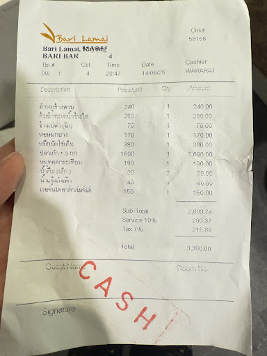 Read moreThe food presentation was interesting and everything was very tasty. Average prices and fancy small restaurant with stunning view. We had tried stir-fried seafood with lemongrass, but unexpectedly, for us, the dish was very spicy, and it was not mentioned in the menu, so we could not finish it. Another dish is shrimp in yellow curry, which was really delicious. Drinks are mocktails were fine. Service charge 10% and tax 7% will be added to the bill. This restaurant belongs to BariLamai resort, which one also looks cozy...