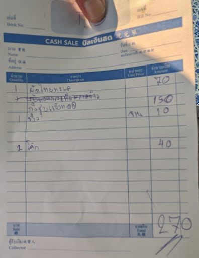 25 mars 2024: Une troisième et dernière fois pour malhonnêteté possible d'une jeune serveuse qui a gonflé les prix. Nous avons commandé deux " Stir fried noodles with seafood" à 70 baht comme mon assiette du 20 mars. Comme vous pouvez voir sur l'addition, elle a chargé 80 pour chaque assiette et 25 pour les Coca-Cola au lieu de 20. Nous avons poliment contesté le total et le propriétaire fît corriger immédiatement les prix des deux repas. Elle nous présente à nouveau l'addition mais sans changer le prix des Coca-Cola. 190 au lieu de 210 alors que le total aurait dû être 180. Je donne 200 en n'attendant pas la monnaie. La dame propriétaire était en beau calvaire et avait perdu son sourire et sa bonne humeur alors que nous n'avons voulu que ne pas payer plus cher que les prix indiqués. Aucune excuse de sa part et de la part de la jeune fille en plus. Dommage de perdre deux clients qui ne recommandent plus ce restaurant.