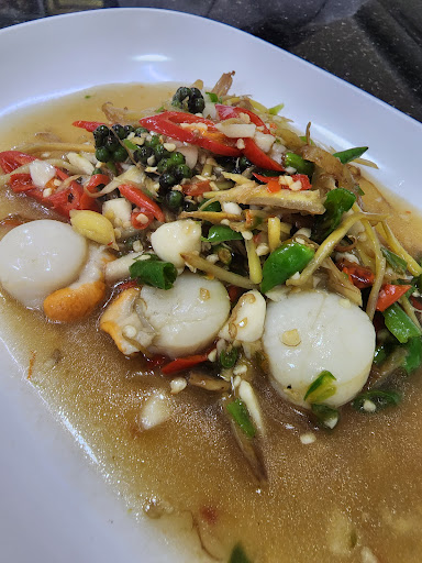 Read moreAuthentic Thai food, each menu is spicy, Boiled Super Chicken Feet was tasty but sticky, Boiled Sea Bass with Plum soups was tasty it has a delicious plum flavor, Stir Fried Scallops with Celery there have 4 scallops and Fried Pork with Chili and Salt is okey not bad and not good, There are open Thai music...