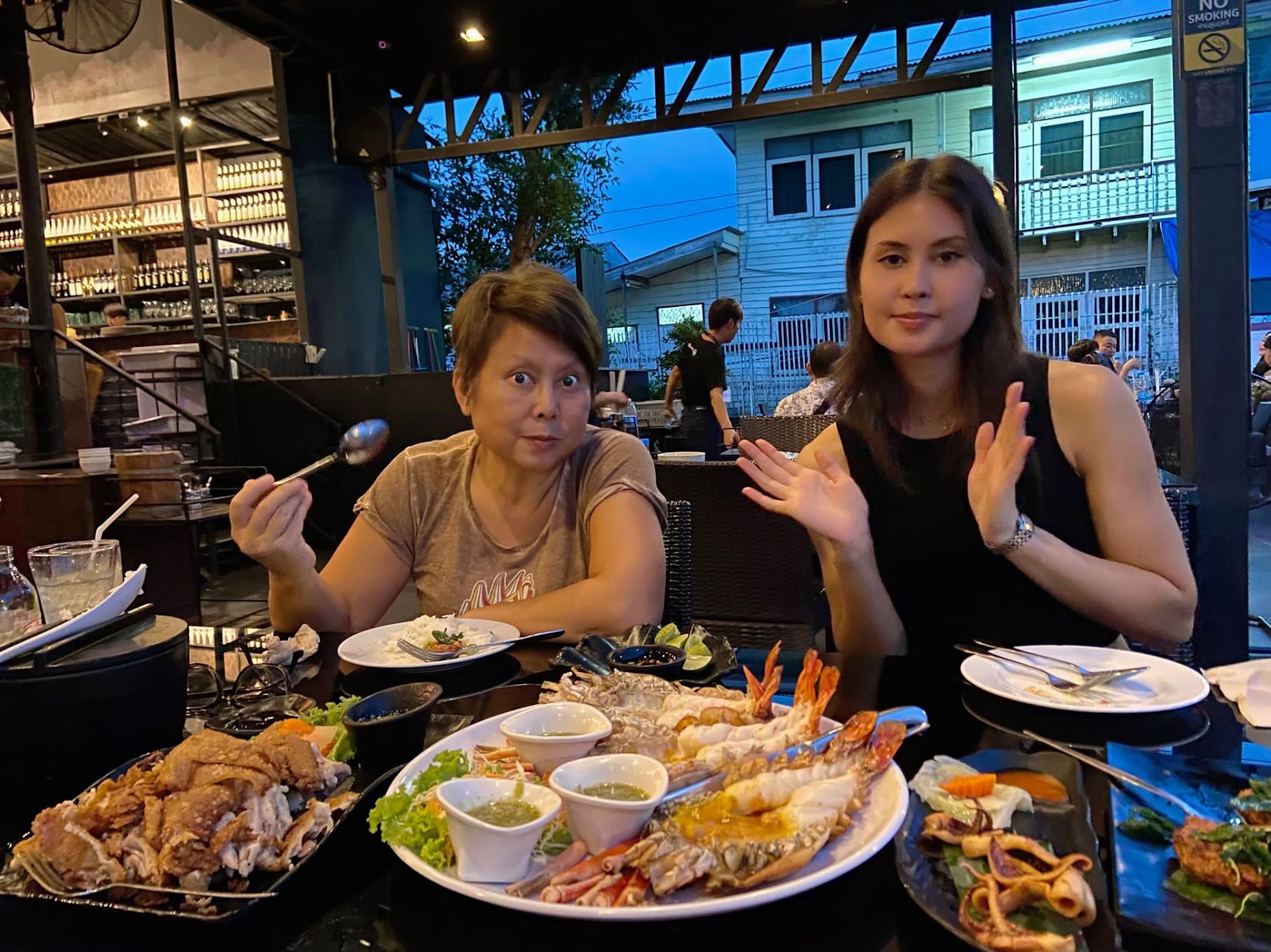 Env: on river bank with optional air-conditioning rooms. A little loud with live music. So not recommended for small children. The band plays 90s Thai pop. They were great. Rest rooms are disrepair but clean with slight but noticeable odor. The place looks better at night than the day. The place winds down around 8pm so you don't need reservation if you arrive later than that.