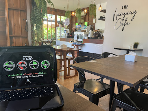 Naiyang Cafe, what a great little spot, literally on the first side road from the Phuket International Airport, 50m down on the left, traditional Thai Building, and if you carry on down 800m or so you come to Sirinat National Park with beautiful trees right down to the beach. This is the northern end of the beach and only a short walk to watch the planes landing. Atmosphere is good, mostly farang (foreigners), great friendly staff and fair prices. I should note if you buy food anywhere that is full of farang you will pay a little more. I bought a latte and it cost 90 baht which is ok. For any meal in Thailand, breakfast, lunch or dinner if you're paying over 100 baht you're can do better. Good tip is look for where the locals are eating and go there, don't be put off by the fact it might not look like a cafe or restaurant you are used to, the food will be amazing and at a great price. The more western a place looks the more you will pay. A note on Siring national park if you are in Naiyang, to enter via the road costs farang 200 baht each, from the southern end walk along the beach is free, from the northern end, 20m back on the left from the pay stand is a side ride, take that and it brings you into the...