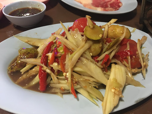 ร้านปิ้งย่าง ที่เด่นเรื่องโคขุนโพนยาวคำ. มีเนื้อทุกส่วนให้เลือก มีหลายเซตให้เลือกเนื้อชุดเล็ก/ใหญ่ ต่างกันที่ความหลากหลายในชนิดของเนื้อ. Set ทะเล set หมู. แล้วก็มีอาหารเสริมหลากหลายเช่น ยำต่างๆ ส้มตำ ข้าวผัด แกง เครื่องดื่มมีตั้งแต่น้ำเปล่าไปจนถึงเบียร์. ไม่ต้องจองก่อน พนักงานเยอะ ดูแลทั่วถึง. ห้องน้ำพอเข้าได้. ไม่แย่มาก มีดนตรีสด และเปิดฟุตบอลให้ด้วย. ที่นั่งมีทั้งในร้านหน้าเวที. นอกร้านไม่มีหลังคา. ถึงแม้ว่าร้านข้างในปิ้งย่างแต่ควันไม่เยอะ. ระบายอากาศได้ดี. เก้าอี้ติดกันแต่ยังให้ความรู้สึกเป็นส่วนตัว. อาจจะเป็นเพราะว่ากำลังเพลินกับอาหาร. ส่มตำลาวที่นี่อร่อย มาทีไรก็ต้องสั่ง. ที่จอดรถก็จอดข้างฟุตบาท. จอดได้ทั้ง2ฝั่งถนน. แต่เดินไกลนิดนึง. มีคนขายของอื่นๆเข้ามาแวะเวียนขายตลอดตั้งแต่ สาวยาคูลท์. พวงมาลัย ขนมไข่หง. ผลไม้. กรอบเค็ม. ล็อตเตอรี่ อาหารไม่จำเป็นต้องสั่งเป็นเซ็ต. เช่นถ้าเราชอบสันนอก. เราก็สั่งสันนอกมาอย่างเดียว5จาน. ก็จะอร่อยกว่ากินเซ็ตที่มีทั้ง สันนอก1จาน. ขาลาย1 จาน หนอก 1จาน. ร้านสะอาด น้ำจิ้มอร่อย. มีน้ำจิ้ม2ชนิด คือ น้ำจิ้มหวานและน้ำจิ้มแจ่ว. น้ำจิ้มแจ่วจะขม ส่วนน้ำจิ้มหวานข้น เพิ่มกระเทียมกับพริกตามใจชอบ. มีตะกร้าผักมาด้วย. ภายในประกอบไปด้วยกะหล่ำปลีฝอย ผักบุ้ง โหระพา และวุ้นเส้น. ถ้าสั่งเซตจะได้ไข่1 ฟอง มาร้านนี้ไม่ต้องคิดเยอะ...
