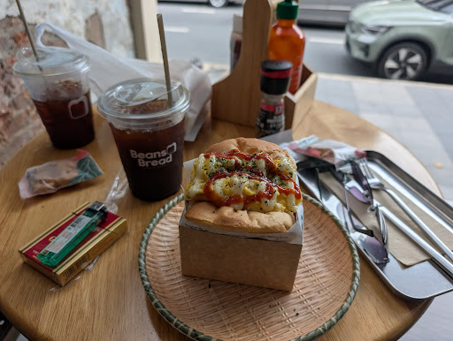 Read moreAI Overview The "Beans Bread" coffee shop offers a delightful experience, highlighted by its visually appealing and seemingly delicious food and coffee. The sandwich, possibly an egg sandwich, looks generously filled and well-presented, suggesting a satisfying meal. The iced coffee, served in a branded cup, appears refreshing and complements the food perfectly. The overall ambiance, with a rustic wooden table and thoughtful presentation, suggests a cozy and inviting atmosphere for enjoying a casual meal or a...