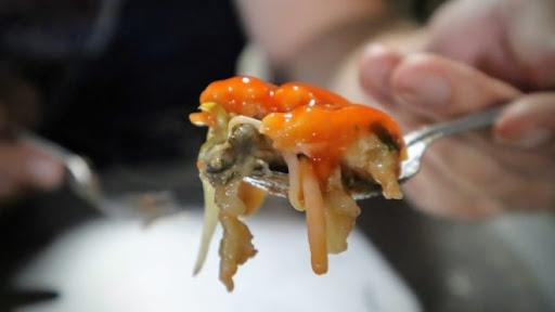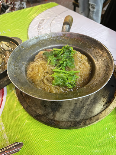 They make a show out of pouring the sauce in front of you with a great sizzle as the pan is really hot. But even after poking around …where was the noodle??? Could not find it. Turns out the egg like thing that the servers were pouring the sauce on was supposed to be the noodle.