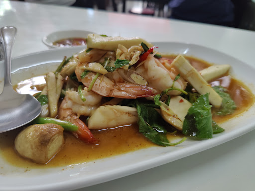 Seafood Tom Yum: sour, tangy, and extremely spicy. Packed with shrimp, squid, galangal, lime leaves, and a host of other Thai herbs. Large bowl. Best eaten with rice.