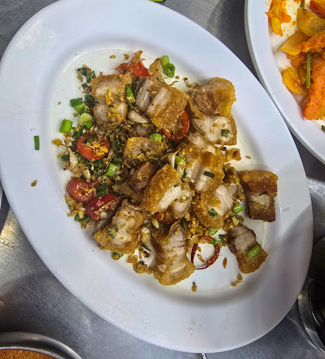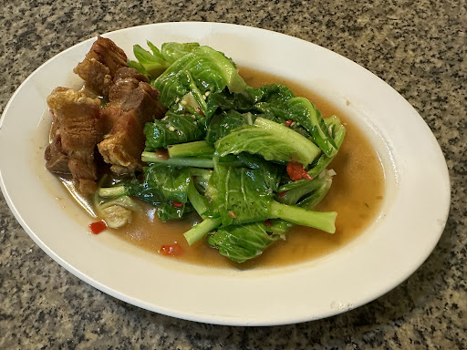 Very kind staff welcomed this hungry and tired traveler who spoke no Thai yet used the photographs on their handy menu to select a delicious dinner of crispy fried pork belly flavored with tons of garlic, and morning glory sautéed with tons of garlic and only a little chili because I told them I have an American tolerance of heat 😅. The restaurant is air-conditioned and there are seats both indoors and outdoors. Beverages include bottled water, Coke and beer. There were three other tables enjoying their dinner when I was there around 8 PM on a weekday. The food was served efficiently, and the staff were...