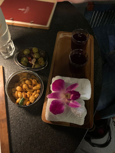 Lily assured me that I could charge my cell phone, which was great because I was really out of battery. Afterwards, we were given a first round of nuts and olives, as well as a small butterfly drink entree, which was included in the service 🍸.