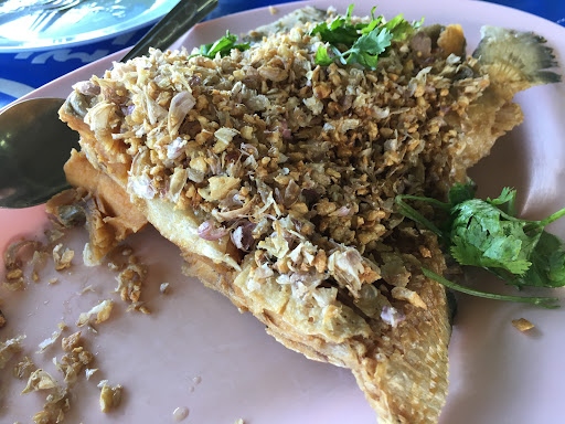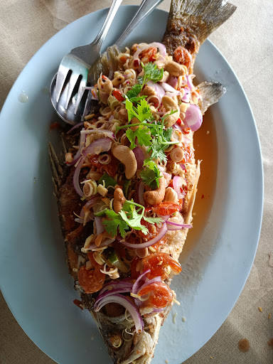 ปลากระพงทรงเครื่อง กินไปขมไป เพราะทางร้านใส่มะนาวพร้อมเปลือกเป็นขิ้นเล็ก... ที่จริงเมนูนี้น่าจะเรียกว่า เมี่ยงปลากระพงมากกว่า .. และแนะนำว่าทางร้านควรจะแล่ปลาให้แผ่ออกก่อนทอด ไม่น่าจะทอดทั้งตัว ความกรอบเลยไม่ได้