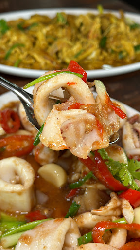 หมึกผัดกะปิกระเทียมโทน (180฿) จานนี้ หมึกสดชิ้นใหญ่หนา ผัดมาได้รสชาติกลางๆ ยังไม่หอมกะปิเท่าไหร่ จะออกมันๆนัวๆ