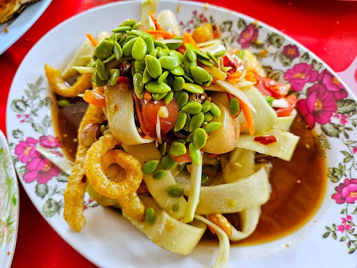 Read moreอยู่ในโครงการสวัสดิการ(ตลาดต้นไม้) จึงพอมีที่จอดรถ ในร้านเลือกที่นั่ง บริการตัวเองตักน้ำแข็งหยิบจานชามช้อนส้อมเอง มีเครื่องดื่มน้ำขวด น้ำอัดลมสั่งได้ ส้มตำอร่อยทุกเมนู อร่อยจริงๆ แปลกหน่อยก็คือตำป่า ใส่ผักหลายชนิด แต่มิกซ์กันแล้วลงตัว รสชาติอาหารมีความอิสานมากๆ แต่ปลาร้าไม่เหม็น ใช้น้ำปลาร้าต้ม เครื่องเคียงหลากหลาย อร่อยเข้ากัน เช่น หมูยอนึ่ง อร่อยมาก เข้ากับข้าวเหนียวส้มตำ แล้วก็ไข่ต้ม เป็นไข่ชนิดพิเศษเรียกว่าไข่ข้าว อร่อย เนื้อไข่ขาวเด้งๆ สีเข้มๆ หน่อย ไก่ย่างปลาเผาสดใหม่ แต่บางวันปลาเผาหมด ก็น่าเสียดาย ราคา ปานกลางไปถึงสูง เพราะส้มตำจานใหญ่ เหมาะมากินเป็นคู่ หรือมากับเพื่อนๆ หรือกับครอบครัว ร้านนี้ส้มตำถ้าไม่สั่งพิเศษจะมาเผ็ดทุกจาน ต้องบอกว่าเผ็ดน้อยหากไม่กินเผ็ด และสามารถซื้อส้มตำกลับบ้านให้สดใหม่ไม่เซ็ง โดยขอให้ทางร้านแยกเครื่องปรุงให้ได้ เมื่อนำกลับบ้านก็เอาไปคลุกๆ ยำๆ เอาเอง...