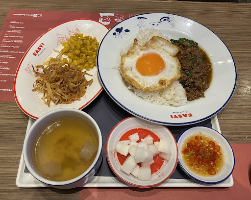 26 September, 2024: Absolutely love this joint. Tucked inside a covered car park, one could easily miss it. But find it you must. It truly is a discovery. We ordered two fried rice dishes and, apart from the meats, expected the fried-rice base to taste the same. We were wrong! Firstly, it had 'wok breath', the taste was balanced, and the rice grains were well separated. Then the surprise - the rice in the 'Pork Holy Basil Fried Rice with Grilled Pork Neck' (ข้าวผัดกะเพราหมูคั่วและ คอหมูย่าง) was fragrantly porky, while the rice in the 'Beef Holy Basil Fried Rice and Beef Steak (ข้าวผัดกะเพราเนื้อคั่วและ เนื้อสเต็ก) had a robust, beefy taste. This is what we call 'attention to detail'. The beef steak was even properly medium-rare as requested. Meanwhile, the 'Grilled Pork Steak with Nam Jim Jaew' (สเต็กหมูปิ้ง น้ำจิ้มแจ่ว) was juicyly meaty, with a slighly charred outside. Deserving a separate mention, the 'Nam Jim Jaew' dipping sauce was fragant, savoury and sour - a great pairing for the meat. Reduce the sweetness, add a bit more heat, and it'll be perfect.