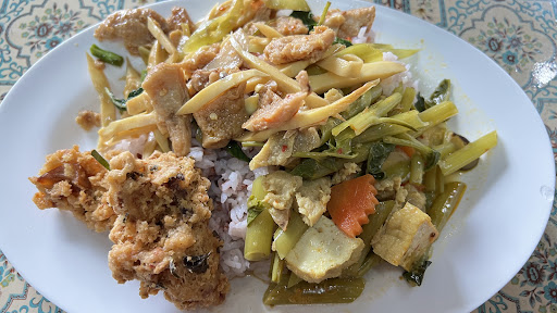 Read moreGood vegetarian food place with cheap price and various Thai flavors. 3 side dishes+ rice is only 50 baht. 2 side dish 45 and 1 side dish 35 I believe. I recommend stir fry vegetables with broccoli, carrot and cabbage, simple but delicious. Stir fried “meat” and beans with red curry paste is also nice but can be a bit spicy- should be okay if you are used to the taste! Sausage a bit salty but still good. Very friendly kitchen &...