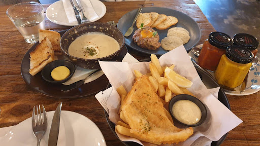 I had a "fush & chups" dish, comprising battered Southern Hake with butter lemon sauce. For chips I chose a standard cut plus a side dish of sauteed mushrooms. While the options were a really nice touch, and the fish and the accompaniments overall quite good, they came with a steep price.