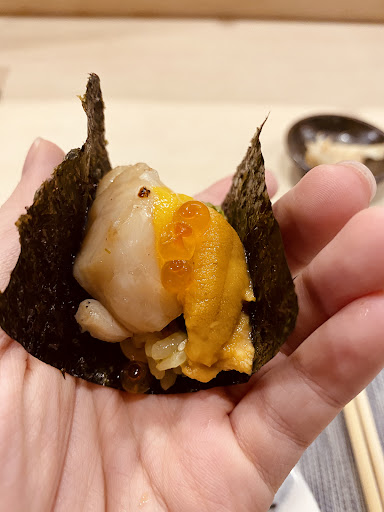 The ingredients are superb but also subject to one's preferences. My personal favourites were the grilled scallop (sweet, chewy texture) and the green tea boiled rice (soft flavour, really prepares the taste buds for what's next to come). The chef was super helpful explaining the meals they were serving, and it's the chitchat, and artistic meal design ideas that contribute to a unique Omakase meal experience. Would come again for the...