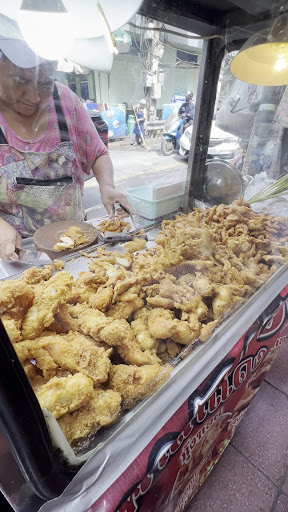 Hidden in the busy streets of Sala Daeng, this small seafood stall packs a serious punch. The menu is simple but irresistible — crispy fried prawns, squid, fish, and even soft-shell crab, all fried golden-brown to perfection.