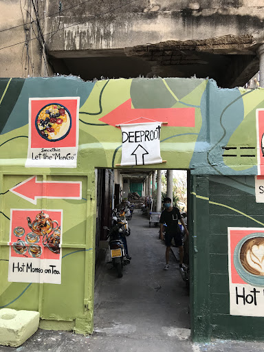 The cafe is hidden behind a small shrine house (ศาลเจ้าแม่ทับทิม), cannot be seen from the Chao Phraya riverside, surrounded by ruined redbrick buildings presumes to be abandon rice warehouses. Seatings are mostly under balcony or large trees, so please do not expect air-con cafe style here. It is more like sitting at someone’s porch in the forest.
