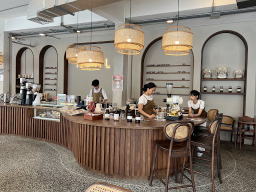 The café’s interior is bright, airy, and thoughtfully designed. Wooden furniture, clean lines, and elegant lighting create a comfortable yet sophisticated vibe. The layout allows both individual guests and groups to enjoy their time, whether for casual catch-ups, study sessions, or business meetings. The barista counter showcases premium coffee beans and brewing equipment, emphasizing the café’s focus on quality.