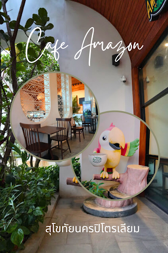 💞 คาเฟ่อเมซอน สาขาสุโขทัยปิโตรเลียม 💯 คาเฟ่อเมซอน สาขาสุโขทัยปิโตรเลียม (บ้านสวน) เป็นอีกหนึ่งสาขาที่น่าสนใจ ด้วยการออกแบบที่ผสานความเป็นเอกลักษณ์ของสุโขทัยเข้ากับความทันสมัยได้อย่างลงตัว มีจุดเด่นที่ป้าย "รุ่งอรุณแห่งความสุข" ที่เป็นตัวอักษรไทยสมัยสุโขทัย และทางเข้าร้านที่โค้งเว้าคล้ายพระอาทิตย์ขึ้น ภายในร้านมีพื้นที่กว้างขวาง เพดานสูง โปร่งสบาย มีโซนห้องประชุม และสวนร่มรื่นด้านหลัง เหมาะสำหรับการพักผ่อน จิบเครื่องดื่ม หรือนัดพบปะสังสรรค์ นอกจากนี้ยังมีเมนูเครื่องดื่มและขนมให้เลือกหลากหลายเช่นเดียวกับสาขาอื่นๆ ของคาเฟ่อเมซอน