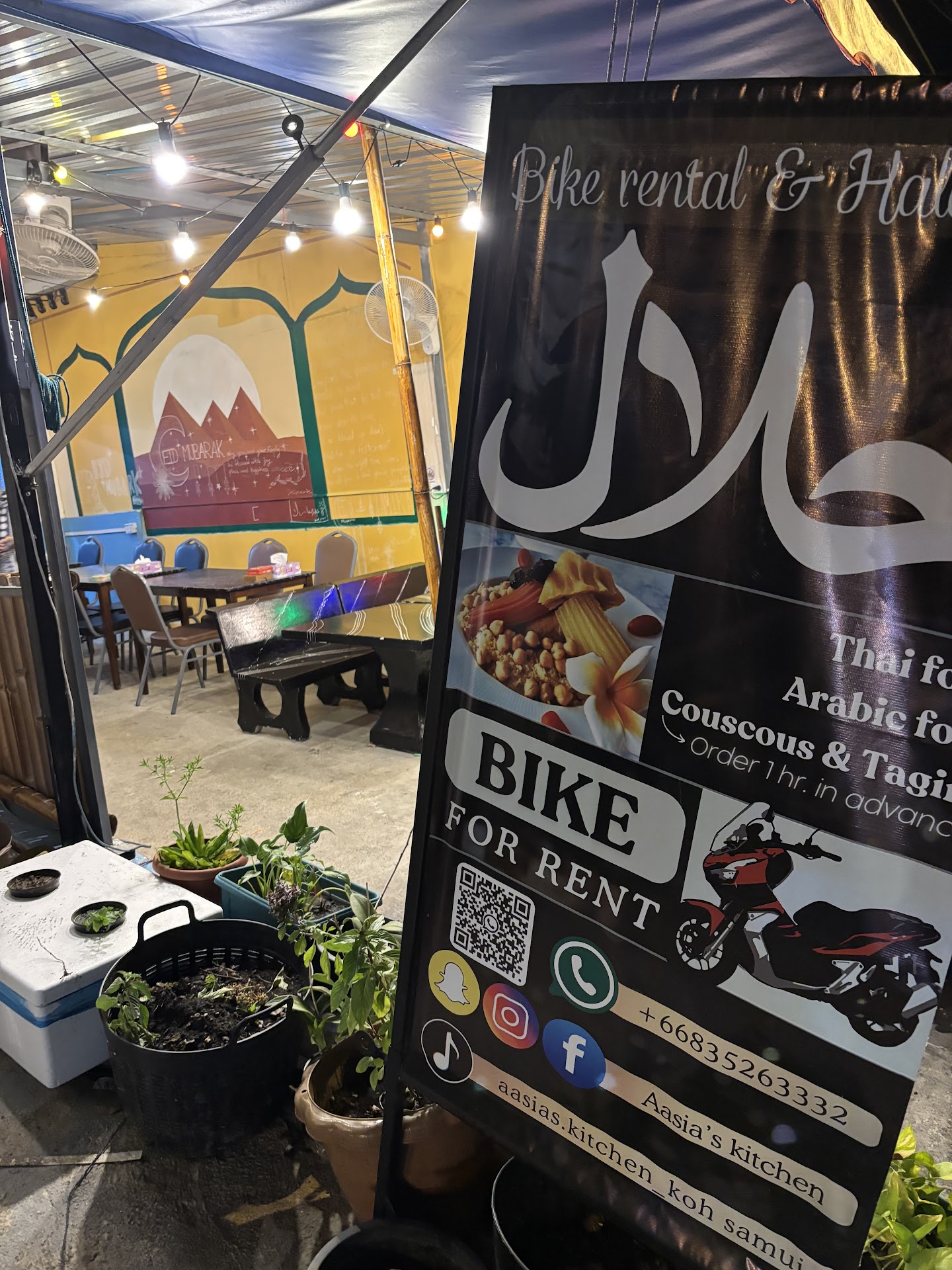 The menu offers a nice variety of local Thai dishes as well as Arabic-style options like lamb kebabs and taginesâsomething a bit different for those craving Middle Eastern flavors. For lamb based dishes you can use the QR code (in pic) to WhatsApp them beforehand