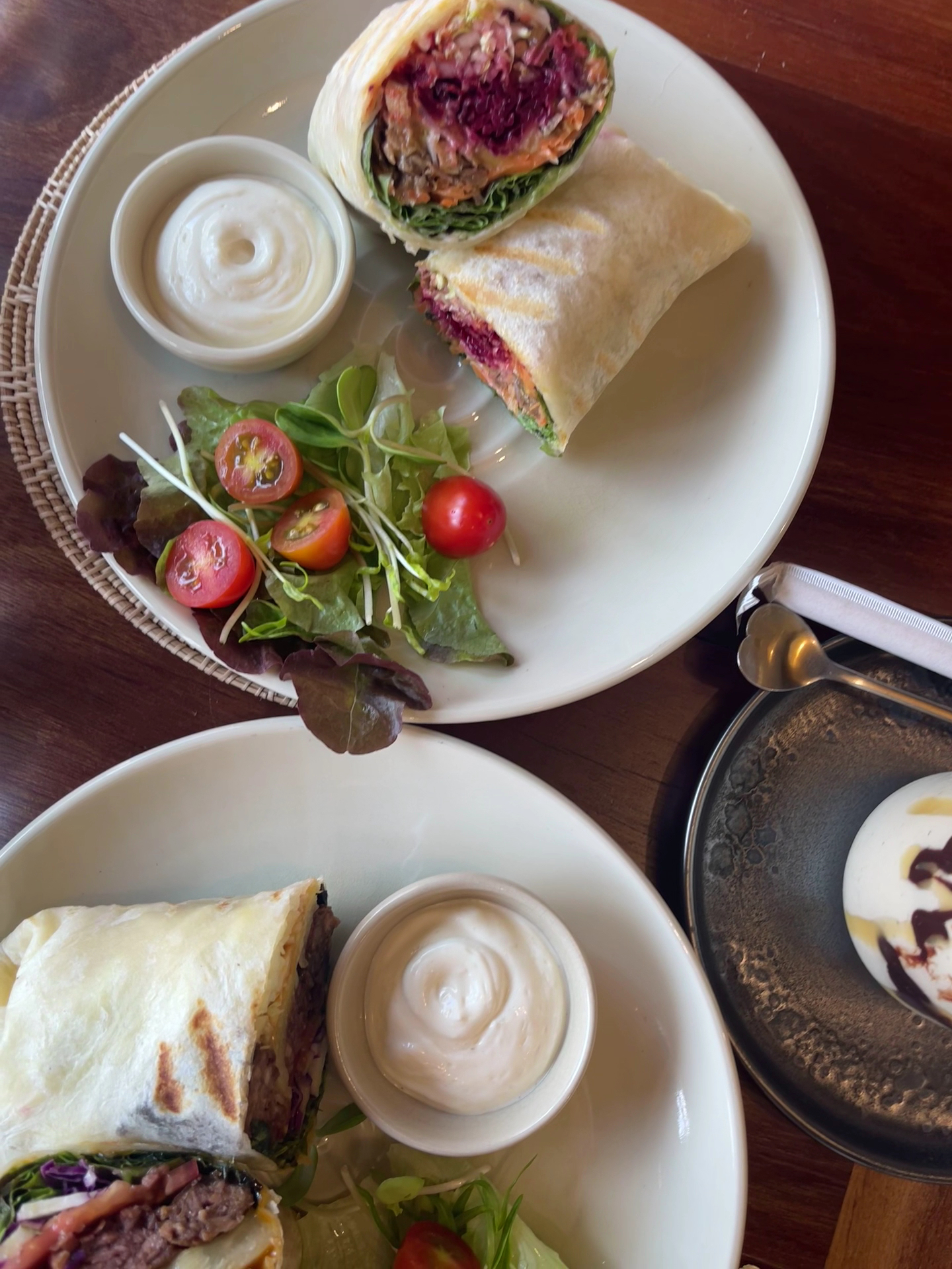 I started with a Thai tea, which was delicious but leaned more toward milk than tea in flavor. For my main, I ordered the Buddha Bowl. Unfortunately, it was quite oily and lacked flavor. The two dressings I received, pesto and hummus, also tasted bland and didn’t enhance the dish. I had to add salt and pepper, but even then, the overall experience fell flat. It just tasted like oil.
