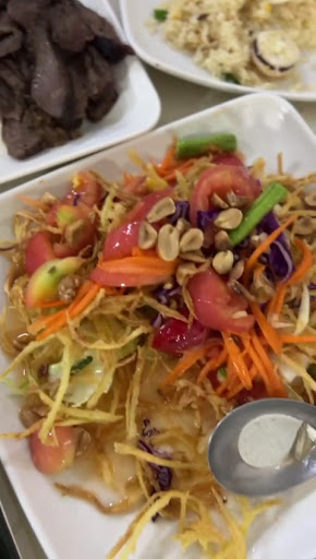 Very delicious and fresh. ปลาเผา is salted snapper fried skin on. You peel th salted skin back and the soft fish underneath is incredible. The fish is stuffed with garlic, kaffir lime leaf and herbs and is so fresh and flavourful. Served with lettuce to make fish parcels with the herbs, delicious Tamarind satay sauce, and noodles). I don't even know the name in English so show them the Thai writing and photo. Very tasty som tam papaya salad (which I guess makes sense given it is their name-dish). Pineapple fried rice tasty but flavour gentle. The curry paste prawns were more like a sweety chilli which wasn't really what I wanted but still nice. Food only mildly spicy by Thai standards but luckily that's what I wanted today. See ice was fast but the restaurant was empty at 3pm. Oh and nice view of glistening sea in the afternoon. It must have beautiful sunset (though maybe a hot one with...