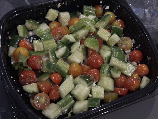 “Greek” salad - the salad seemed heavy by weight but that’s because the entire thing was mainly cucumbers! See attached photo. Very skimpy on the olives and feta cheese and anything that was expensive. Cucumbers are presumably the cheapest vegetable in the salad. Oh! They also don’t even include any dressing for the salad, just half of a lime and good luck!