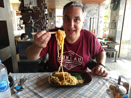 Read moreWe went there to eat in the restaurant located downstairs. We ordered Pad Thai with chicken which turned out to taste nothing like original Pad Thai. It tasted like someone replaced the tamarind and fish sauce with some cheap ketchup. The chicken had some hard pieces in it and was a bit dry. The peanuts were barely chopped and there was no lime juice for the taste. After the meal we ordered ice coffee which was ok. Service was very nice. Summing up - nice place to sit and chill with cold beverage, but eating here...