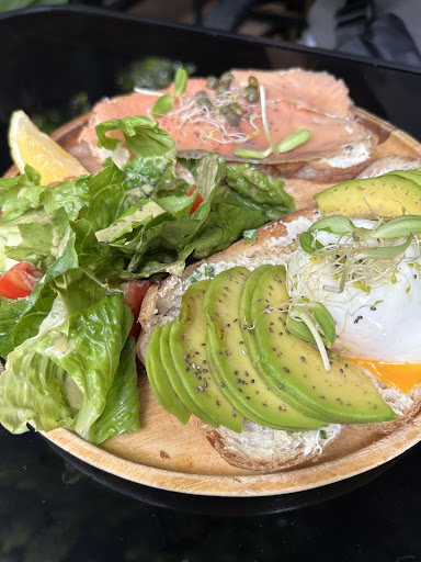 The avocado toast with smoked salmon was delicious: fresh sourdough bread, ripe avocado, and a perfectly poached egg, just as it should be.