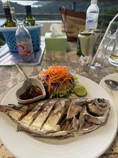 As a previous review helpfully stated, this place is tricky to find. I would also point out that it is rustic to say the least and we found ourselves missing the second set of stairs on our way in and stumbled into what looked like someone’s residence. Anyway, we found the restaurant despite a couple of wrong turns and the views down to shark bay and across to another bay beyond were awesome. Having taken our fill of selfies and photos, we sat down, ordered some drinks and started to take in the menu. We were advised that there was no fish today, but seafood and everything else was available. Both our meals were excellent, tasty and had more chicken/ seafood than we had become accustomed to. The meals were tasty but not spicy. However the condiments on the tables were wide ranging - a mild chilli sauce, Maggi sauce, ketchup, olive oil, balsamic and salt & pepper. I had seafood with chilli and pepper with plain rice. It had the typical three or four large shrimp accompanied by lots of delicious squid. It was very tasty but it was even better (to my taste) with some extra chilli sauce. My wife had the chicken salad which she really enjoyed and commented that it was flavoursome and had much more chicken than seems to be the norm here. Our bill was less than we expected, especially based on the quality of the food. We thoroughly enjoyed our lunch here and have some fantastic photos as memoirs. The journey here on foot from the Haad Tien Beach Resort was hard work in the heat and definitely not for the infirm, but we are both in our fifties and are very glad we made the effort! Make the effort to get here and we’re sure you will agree that it...