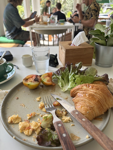 Read moreI went without any big expectations, but I was really impressed. The space is super cute, full of plants and nice decorations. There’s no air conditioning, but there are fans everywhere, and it still feels fresh and cozy. The atmosphere is peaceful and welcoming. The staff were kind and friendly, which made everything even better. I ordered a croissant with scrambled eggs and shrimp. Honestly, I thought it would come with just a few small shrimp, but it was full of big, tasty ones. They were really generous, and the food was delicious. I was so happy with my meal. I also had a matcha latte, and it was very good. My friend got a burger and liked it a lot too. Everything was great. I think it’s definitely...