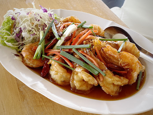 Excellent location. You get a view of the lake and National Park and the damn from here that is superb. The food is very good. The only negative was that they were going to play really loud music but I and another table told them to please not to and they didn't. I guess another thing that might bother some people is there's a significant amount of mosquitoes after the sun goes down. But the staff will bring a mosquito smoker to the table that you can put down by your feet that seemed to help a little bit at least for my legs. It wasn't that bad. But the mosquitoes are pretty big :-). The food was better than basic Thai style and the location was exceptional and restaurant was clean. Thus my four star. If you're in that area to go see the dam I would recommend staying at one of the Bungalows or hotels inside the park and having dinner here. No doubt a...