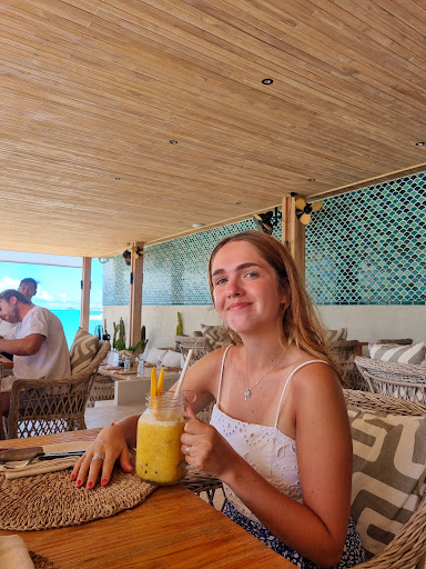 After reading the reviews we decided to stop by and spend some time at the beach at this restaurant. First of all, the prices are pretty high, the beach itself is not the best quality for swimming. Although the view from the restaurant is nice. I ate watermelon a salad, which was ok but...