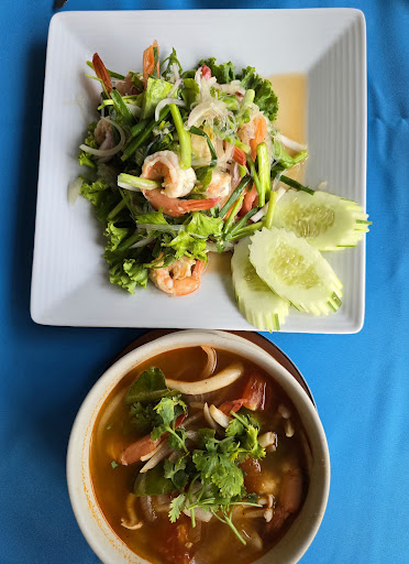 I really don’t understand positive reviews about this place. First of all it’s not relaxing place,all members of the staff are just standing right in the middle or walking around which creates weird and tense atmosphere. Imagine you are being watched while you are eating? The food is not any better.Completely tasteless, absolutely everything we ordered was inedible. They even managed to do something wrong with tofu, it tasted strange, it was fried tofu, but it tasted like it was cooked from frozen- but not properly cooked.So, to be on the safe side after one bite I decided to leave it. My husbands prawns were mashy, again like they were left defrosted for to long. The rest of the food, salads and rice were tasteless, no spices, no flavour. They brought everything at the same time, within 10 minutes since we ordered, which just confirmed my suspicions about the freshness of food. How this is Thai restaurant...
