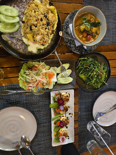 Didn't eat from the grill, only ordered Thai style dishes. Pineapple fried rice, papaya salad, scallops (not very Thai!) red Duck curry and morning glory ( a type if green vegetable, like water spinach). First up, having lived in Thailand, I know good Thai food and can compare it to the offerings in the West, specifically London and Melbourne. The red curry is supposed to be made with a roasted duck, not just a duck that has been cooked and sliced. The duck was also very tough meat, which signals either frozen, over cooked or days old. The scallops were also tough, but, very well flavoured and presented. Pineapple fried rice, very tasty with ripe pineapple. Papaya salad, too much carrot, which unfortunately is a common thing nowadays. Asked if a 3 per cent service charge was OK, which could be a good way to say it's the credit card surcharge, which I didn't mind. Not crowded and a huge TV to watch sports if that's your thing. A...