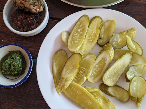 First time, I ordered the tabbouleh (wasn't authentic as there were chunks of parsley and needed more zest/lemon) however was still enjoyable to eat. I had 2 pieces of lamb which were disappointingly very small but deliciously tender and cooked to medium-rare. If you're a pickled vegetables fan, you can't go past their homemade pickled cucumbers to help balance your tastebuds. Their spicy green dip had a subtle kick and doesn't have a dominant flavour so it's best as a mix-in, than a dip per se. Coconut water fresh in its shell comes with a straw and spoon however the coconut was warm (usually street coconut can be served from fridge) and because it was so young and green I couldn't scoop out much flesh. Was still delicious.