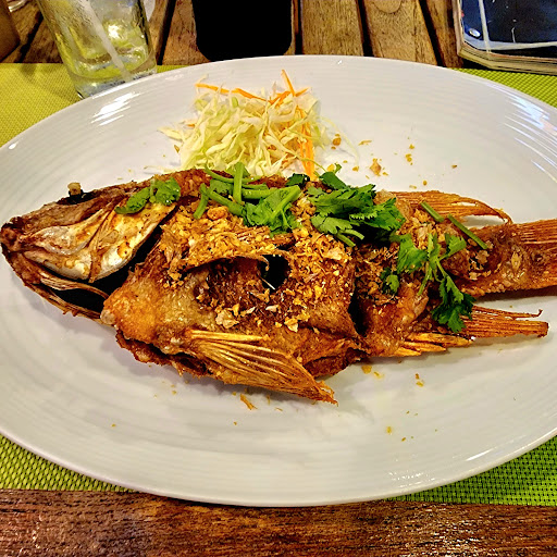 When it arrived at my table I was shocked at how much food there was! I had a whole fried red snapper, steak which was cooked a perfect medium rare (ask for medium if you want it medium rare which is pretty standard for most restaurants in Thailand I find) and also pork ribs, a chicken leg, two shrimp, corn, potatoes, gravy, and bbq sauce! 🤤🤤🤤