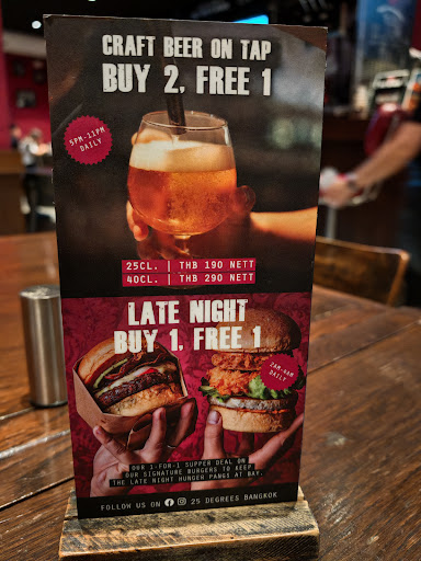 Read more25 degrees won first place in the Hamburger competition this year (September 2016) so I wanted to give them a try. They also have vegetarian burgers here, which was the other reason to check them out. I ordered the #3:Mezzo Seco Jack, Green Chili, Chipotle, Avocado,well done and it was absolutely delicious. The hamburger was served with lettuce, tomatoes, onion and homemade pickles on the side. I also ordered the onion which had a nice light batter. They have happy hour from 3-7 where they have 4-5 items that are buy one get one free for 80 baht. I like to take the MRT or BTS wherever I can. To get here using public transportation take the MRT to Si Lom and then interchange with the BTS Sala Daeng to Chong Nonsi from there it's a a quick 7 minute walk. However you do have to cross Silom to get to the Pullman Hotel where 25 degrees is located. This is a small cozy place with a diner feel to it. They have an outdoor smoking section. Give them a try you won't be...