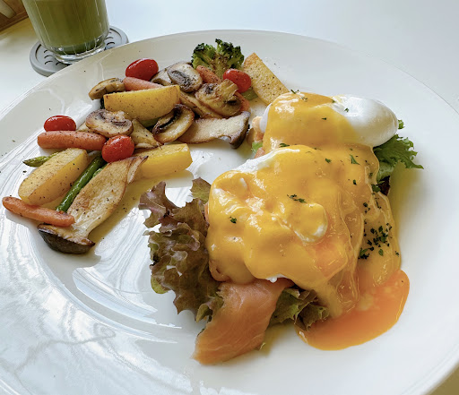 Seems like a stylish cafe in the middle of the town. I was looking forward to coming here. An over-expectation can lead to disappointment. I’ve heard that the place is a coffee bean roaster. Actually, I should have tried a hot coffee. Feeling sweaty like a pig) So I ordered iced matcha espresso which costed 120b per serve. It was nice but didn’t make me wow. When I asked the staff for the dish, “Egg Benedict”, they looked each other and looked at me back like being reluctant to get the order. I heard them whispered, “can we make it?” I wish that time they answered me, apologies we couldn’t be bothered to cook or something… why? Because the served eggs were an error. The biggest mistake was the hollandaise sauce which is the key element of the dish. It’s supposed to be gently sour and not sweet at all. This tasted like a mixture of really sweet mayonnaise mixed with white vinegar. The side was grilled vegetables that were well-cooked. Maybe it’s sort of a place to grab a drink or two before hopping around the town, not...