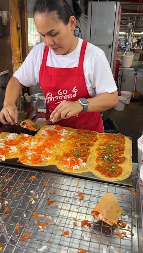 Visiting Sarinthip Thai Khanom Buang in Talat Phlu is truly a memorable experience, one that immerses you in the charm of traditional Thai street food. Located beneath a bridge in this vibrant Bangkok district, the stall’s long-standing presence adds to the allure, making it feel like you’re stepping into a piece of history. As soon as you arrive, you’ll likely find a steady line of customers eagerly waiting for their turn, but don’t let that discourage you—the process is efficient, and the wait is part of the experience.