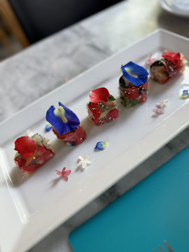 🌹 ห่มรักในสวน 145 บ. เมนูมังสวิรัติ แป้งญวนห่อด้วยเส้นหมี่ยำ แครอท แตงกวา กลีบกุหลาบและดอกอัญชัน (ทางร้านปลูกเอง) รสชาติออกหวานอมเปรี้ยว ทานแล้วสดชื่น