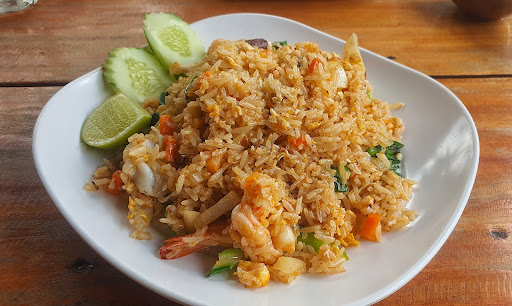 🍲🥘🥗 We ordered stir-fried red curry chicken with fried-egg on rice and seafood fried rice. The portion was generous. Both dished were tasty. The price was cheap if compared to other restaurants in the same area. It was just 80 baht for seafood fried rice.(In most of the restaurants with this price you will get only tofu or vegetarian dish.)