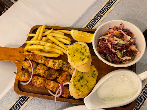 The servers were warm and welcoming, and the service was good overall. I ordered the souvlaki kalamaki, calamari, and a singha beer. The souvlaki chicken and pork skewers were really dry. There was no moisture or tenderness. The garlic bread was really good; buttery and garlicky. The salad was more of a coleslaw, and I did not particularly care for it.